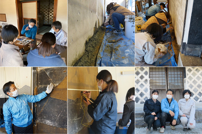 この建物「上(かみ)の家」は文豪・井上靖の母の実家です。壁や梁などの老朽化が顕著で、伊豆市の委託を受けて西森研究室(建築デザイン学科)と田村研究室(建築学科)が改修し、11月23日にお披露目しましたが、文化的な価値を保つため田村研究室は旧来の土壁・漆喰壁の補修を続けています。この日は、漆喰壁の補修となまこ外壁の汚れ部の削りだしを行いました。